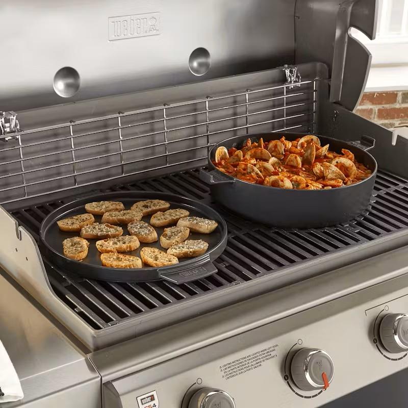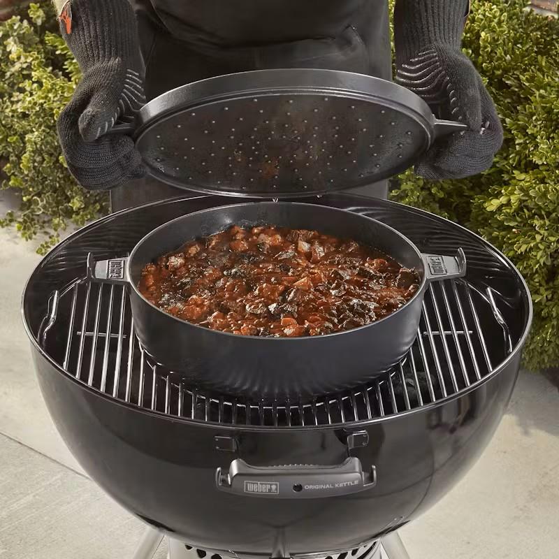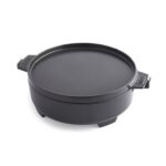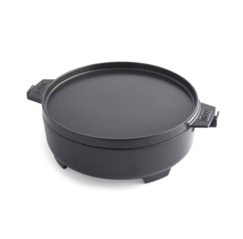 Esta panela multiusos cria possibilidades infinitas no grelhador. A panela em ferro fundido, com capacidade de 6,8 litros, garante uma distribuição uniforme e retenção do calor para assados tenros ou sopas e guisados saborosos. A tampa com dupla função transforma-se numa placa plana que tosta sanduíches ou cozinha na perfeição peito de frango e vegetais. O acabamento com revestimento esmaltado torna a limpeza fácil e as duas peças podem ser empilhadas, poupando espaço quando não estão a ser usadas.