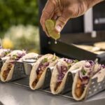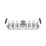 Impressione amigos e família na sua “noite de tacos” com este óptimo suporte para tacos premium em aço inoxidável, com espaço para seis tacos. Dê asas à criatividade: use-o para aperitivos, panquecas, pão pita ou kebabs. As pegas em silicone facilitam o transporte do grelhador para a cozinha. Os dois copos para molhos integrados mantêm os seus molhos favoritos sempre à mão, numa composição que combina o útil com o delicioso!